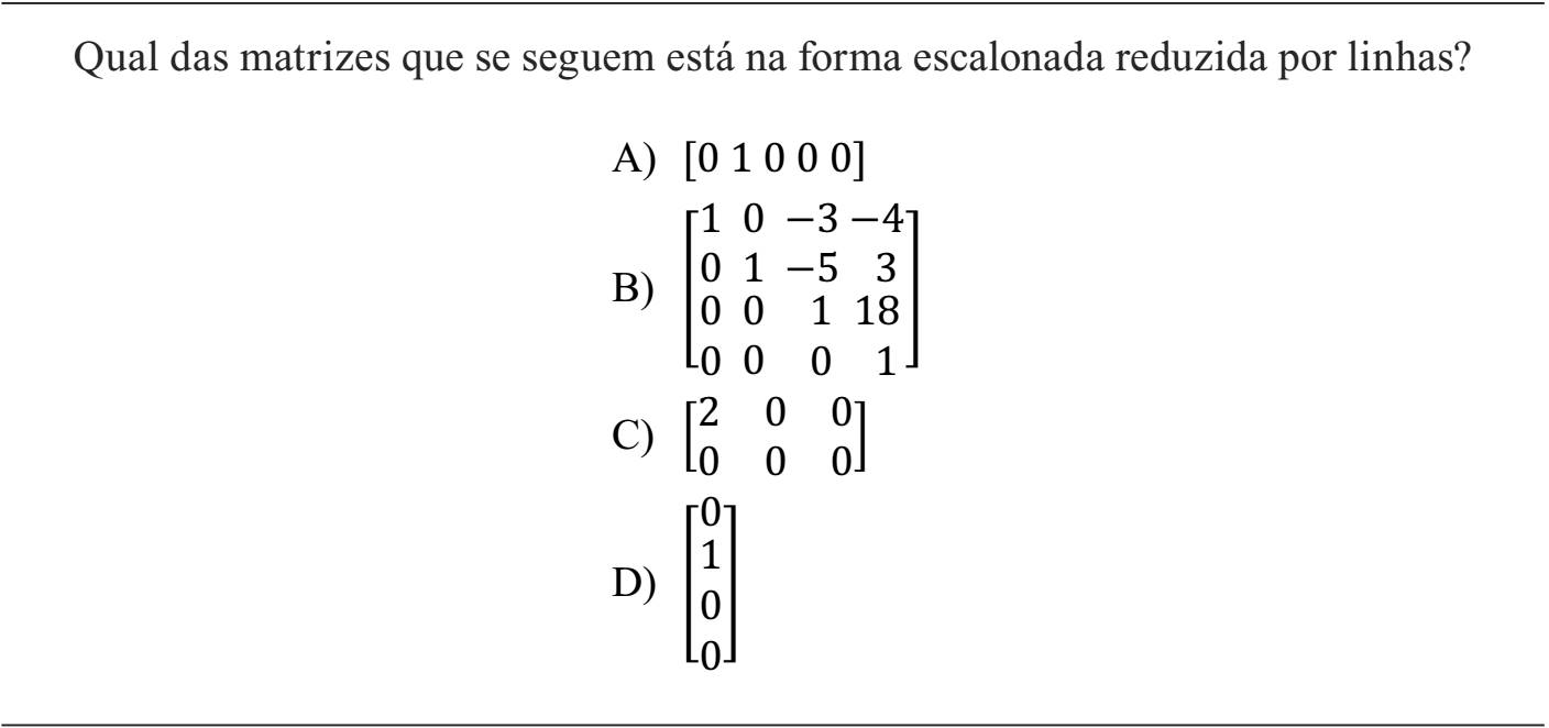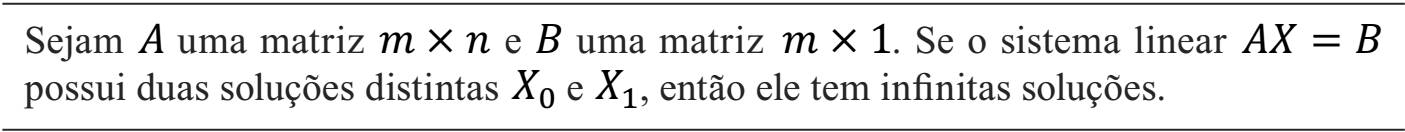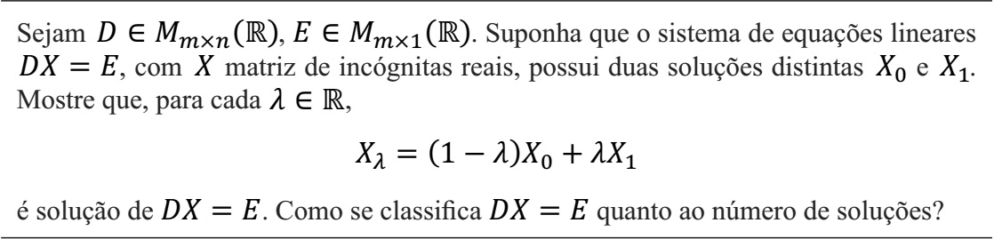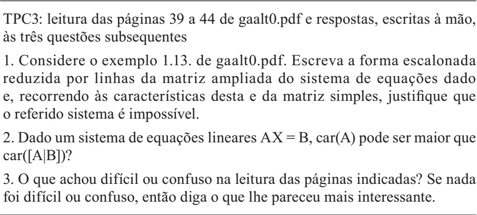 A tarefa TSPI na Fig. 5, de um teste de avaliação, é inspirada num resultado clássico de classificação de sistemas de equações lineares com incógnitas reais. Uma demonstração compreende as seguintes partes: para cada λ Є ℝ, χλ é solução de DX=E; se λ1 ≠ λ2 então Xλ1 ≠ Xλ2; a classificação indeterminado por ℝ ter um número infinito de elementos. O mencionado resultado, na Fig. 6, e uma demonstração constavam das páginas para leitura no TPC3, preparatório para uma das aulas.