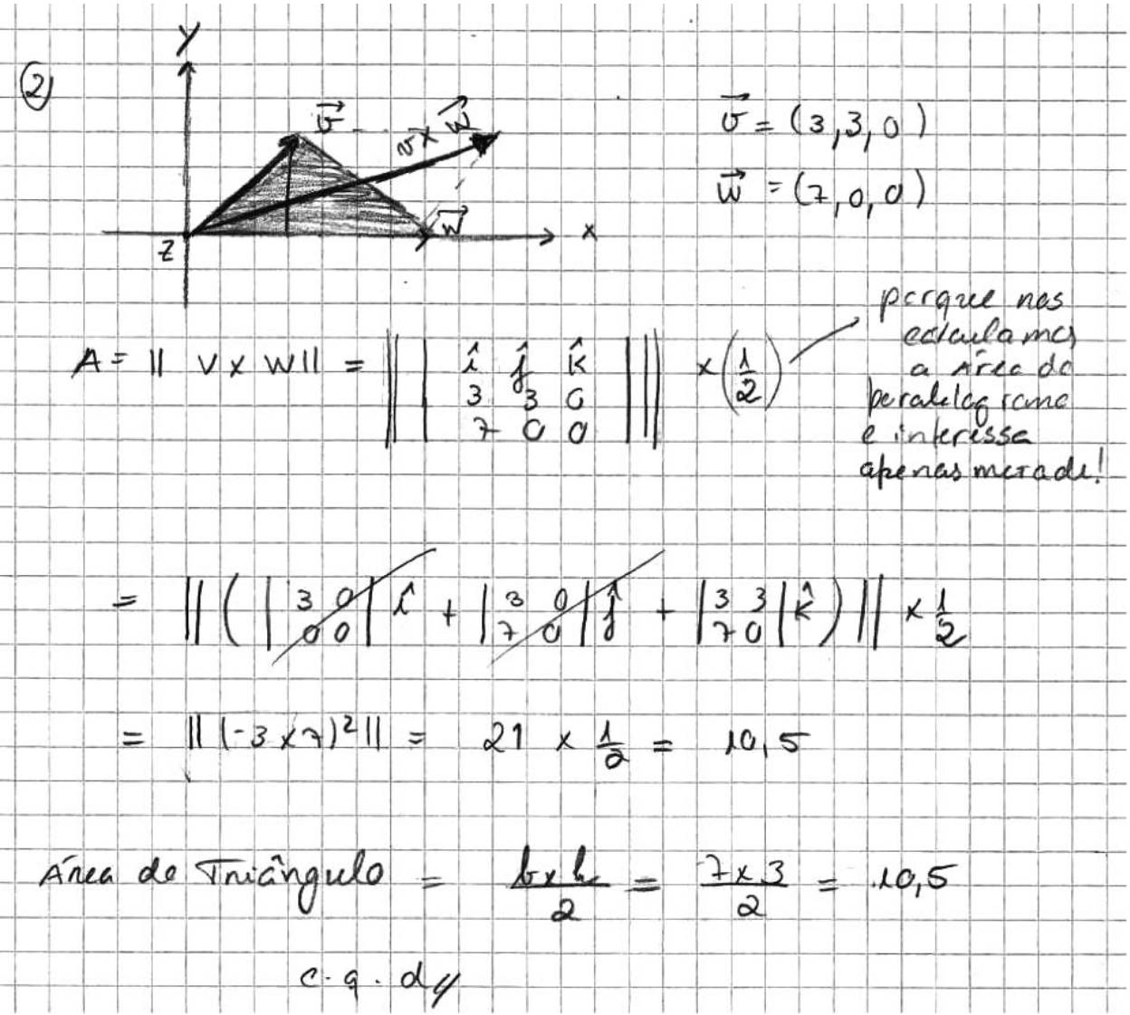 Na produção da Fig. 21 para a tarefa TAPL, o Pedro elabora um esquema de demonstração empírico, indutivo, com nível 1. Com efeito, assinala com a expressão “c. q. d.”, em linguagem verbal, que conclui o pretendido a partir de dois vetores concretos do espaço, isto é, valida empiricamente. A escolha recai numa representação bidimensional, em linguagem visual e em linguagem algébrica, pela particularidade das cotas de ν e w serem iguais a zero. Na entrevista, atribui o significado de demonstração implicada por regularidade esperada ao esquema.