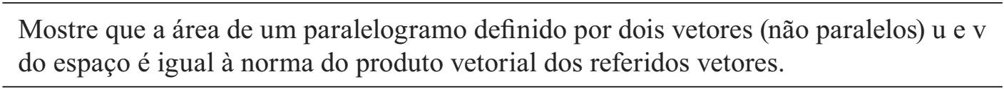 Na tarefa TAPL na Fig. 7, um trabalho de casa, pedia-se uma demonstração para uma fórmula da área de um paralelogramo, definido por dois vetores (não paralelos) u e v de ℝ3, que envolve o produto vetorial desses vetores. Para além do conceito de produto vetorial de vetores do espaço, a resolução passa pela aplicação de uma razão trigonométrica conveniente. Concretamente, há que relacionar a altura do paralelogramo com um dos seus lados e com o ângulo formado pelos vetores u e v.