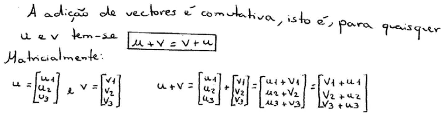 Na produção da Fig. 8 para a tarefa TCAV, a Alice começa por escrever o que é pedido em linguagem verbal. Pode observar-se, depois, a conversão para linguagem algébrica com a igualdade u + v = v + u, que salienta com recurso à linguagem visual e complementa com a explicitação “para quaisquer u e v”. Em nenhuma das linguagens a Alice menciona que os vetores são do espaço, mas, após o tratamento em notação matricial com matrizes coluna de tipo 3×1, nota-se que assim os considera.