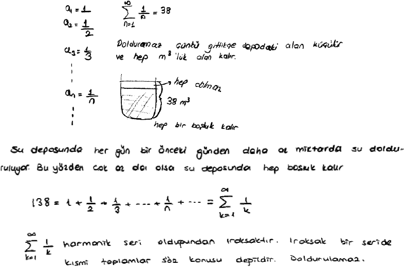 Various inferences of the pre-service teachers regarding the water tank problem and the various bases for their explanations and their solutions are related to the differences in their application of their theoretical knowledge to the practice. Even though some of the pre-service teachers modelled the solution of the problem by using some drawings, notations or symbols related to the amount of water flow with harmonic series, they claimed that the water tank cannot be filled completely because that harmonic series is divergent underlines the necessity to focus primarily on the concept of “divergence”. Thus, it can be said that they could not make a transition from theoretical knowledge to practice.