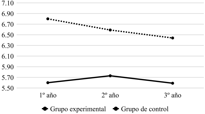 Igualmente, cabe señalar, que si bien existe cierta disminución en la media en matemáticas en los alumnos del grupo experimental a lo largo de los tres cursos académicos (Figura 10), dicho descenso en las puntuaciones no es significativo (p>0,01).