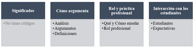 • Significados: Esta categoría representó lo atribuido o asociado a un conocimiento y las relaciones que guardan. Son conocimientos institucionalizados en el profesor que refieren a aspectos observables, descriptibles. Funcionan como referencias no cuestionables, invariables, que articulan varios conocimientos implicados.