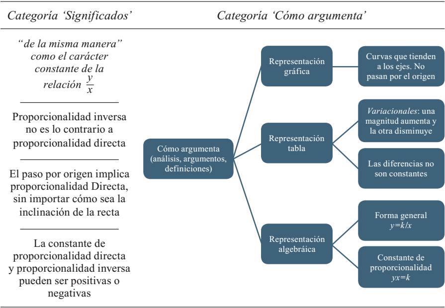 Ambas categorías sistematizan el conocimiento del profesor al momento de la confrontación. De esta manera, las categorías, con sus respectivas articulaciones entre ellas dejan ver cómo es la base de significados, procedimientos y argumentos del docente respecto de la proporcionalidad directa que regulan su práctica de enseñanza.