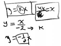• En la expresión algebraica, la forma general y=kx es la representación de proporcionalidad directa, ya que la ordenada al origen es cero. En esta expresión, k es la constante de proporcionalidad si y solo si es positiva. No existe la constante negativa porque ni la definición ni la expresión general refieren a un valor -k.