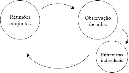 Boavida e Ponte (2002) sublinham que no trabalho colaborativo tem lugar o desenvolvimento de atividade para atingir determinados fins, pensando, preparando, refletindo, formando e empenhando-se, pelo que a colaboração requer do professor partilha e interação do que a simples realização de diversas operações. Assim, o programa colaborativo desenvolvido organizou-se em ciclos de atividades, consistindo cada ciclo na seguinte estrutura padrão: a) reuniões conjuntas com todos os professores participantes, para reflexão sobre aulas observadas, esclarecimento de dúvidas e preparação de aulas a observar; b) observação de aulas de cada um dos professores participantes; c) entrevista individual, no final da aula, entre cada professor e a pesquisadora, para reflexão sobre a aula observada (Figura 2).