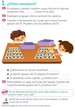 La primera actividad planteada por Diana a sus estudiantes fue solicitarles el conteo de objetos de una caja, tal como lo plantea el LTG-M1° (ver figura 2). Desde el libro, se sugiere propiciar que los niños, al contar estos objetos, cambien el conteo de uno en uno por un conteo a través de agrupamientos distintos -de dos en dos, de cuatro en cuatro, de cinco en cinco, etc.- y con esto se den cuenta que la manera “más fácil para contar” es hacerlo de diez en diez. Desde esta pretensión, Diana solicitó a los niños, una y otra vez, que contaran rápido, buscaba con ello desestimar el conteo de uno en uno, que ya sabían hacer, y lo sustituyeran por uno más económico que les ocupara menos tiempo. En el siguiente fragmento se puede ver el intento de Diana por cumplir esta pretensión de los autores del libro:
