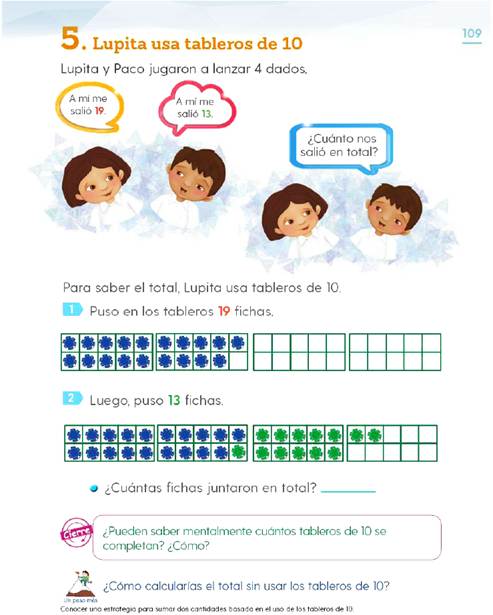 Para los niños resultó difícil retener la cantidad total del primer turno -que obtenían contando los puntos, después de contar los de su compañero- y retener la cantidad total del segundo turno para, finalmente, estimar la suma de las dos cantidades y registrarla. Aunque el material que repartió Mariana estaba acorde con lo que se solicitaba en el LTG-M1°; después de las dificultades con la estimación, la lección se tornó aún más compleja, pues con todo y el material que tenían en sus mesas, Mariana les repartió Tableros de diez para que estos les ayudaran a comprobar resultados. Si bien, se trataba de un material no previsto para esta lección del libro de texto, a Mariana le pareció pertinente. Esta decisión pudo estar influenciada por la sugerencia de la lección 5 de usar los Tableros de diez para comprobar sumas, con la misma actividad de la lección 4.