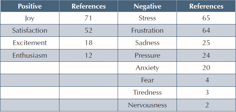 Emotions reported by participants can be divided into positive (emotions experienced because of their interaction with students) and negative (emotions experienced because of their interactions with colleagues, authority, lack of time to perform all the roles expected from them and the workload they had).