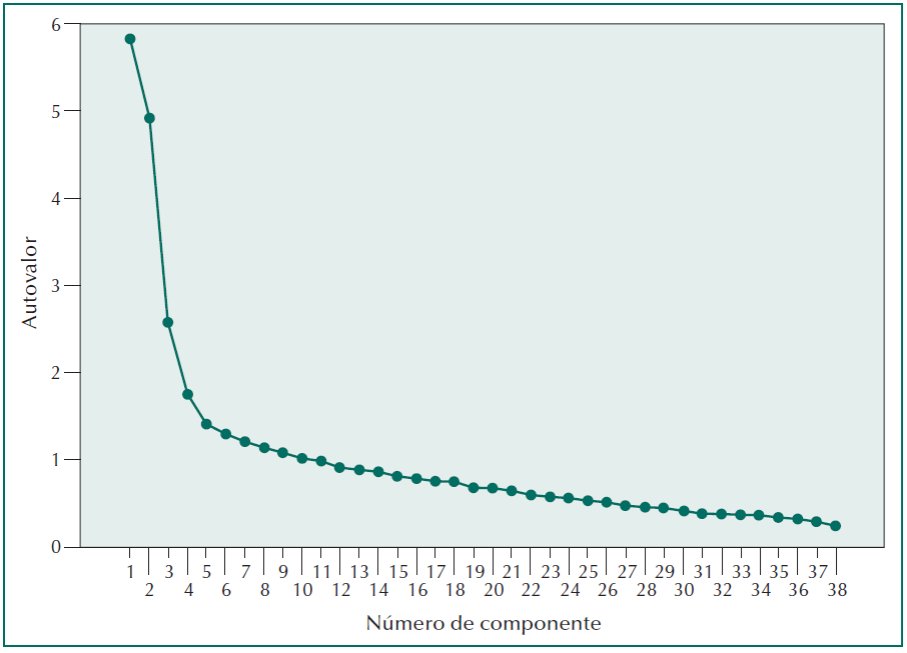 A continuación se realizó un análisis de componentes principales y se procedió a la rotación Varimax. A partir del análisis factorial realizado, se retuvieron diez factores con auto-valores superiores a uno, que explicaban el 58.30% de la varianza total. De acuerdo con el gráfico de sedimentación (Figura 1), el valor de los componentes sugería una estructura de cuatro factores con auto-valores de 5.81, 4.92, 2.56 y 1.74, respectivamente.