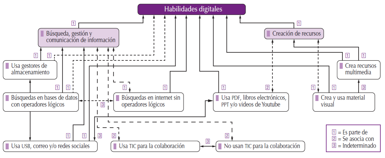 Como se aprecia en la Figura 2, arriba al centro se representa la categoría habilidades digitales básicas y, arriba a la izquierda y a la derecha, las dos subcategorías en las que ésta se divide: A.1. Búsqueda, gestión y comunicación de información y A.2. Creación de recursos. Los demás representan los códigos asociados a cada subcategoría y las relaciones encontradas entre ellos.