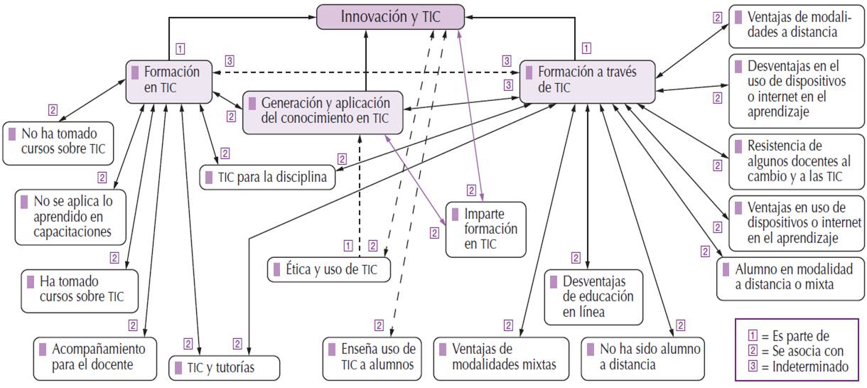 La categoría Innovación y TIC analiza la creación de estrategias de aprendizaje permanente usando TIC, así como líneas de acción e investigación sobre las relaciones entre TIC y las ciencias jurídicas y afines. En la Figura 4 se muestra, arriba y al centro, la categoría, y las subcategorías en el sector inmediato alrededor de ésta y, a mayor distancia, los códigos vinculados a cada una de las subcategorías.