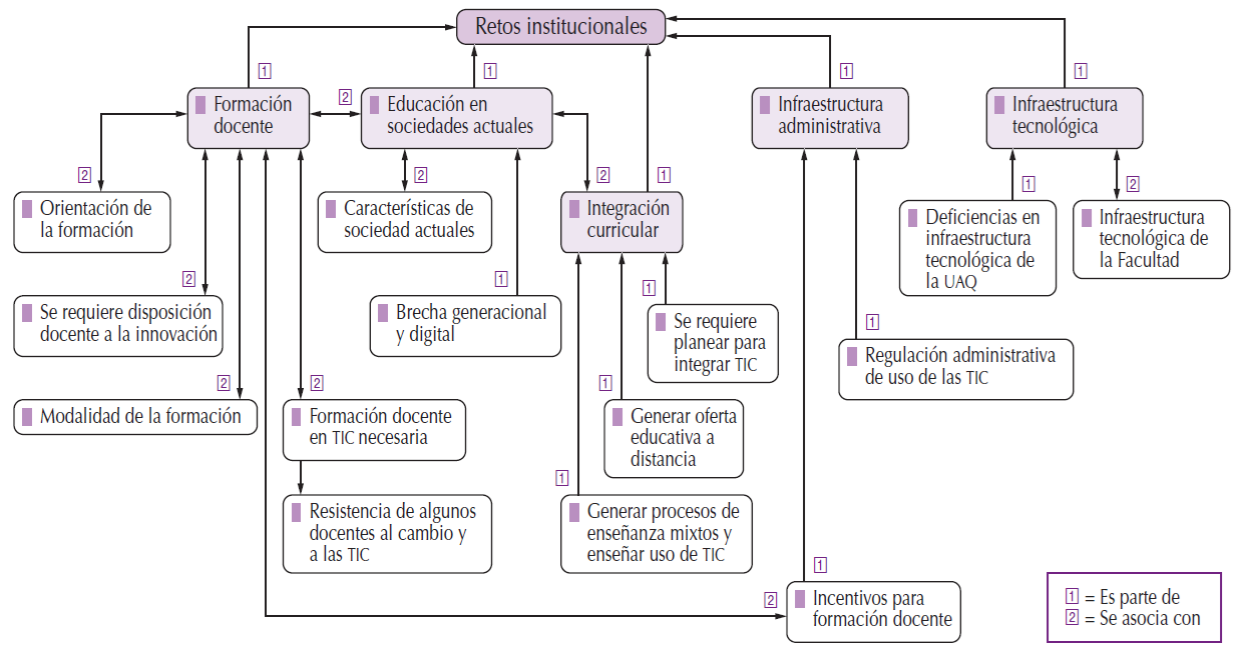 Como se evidenció en el apartado anterior, derivado del análisis emergió la Categoría D. Retos institucionales, con sus respectivas subcategorías y códigos, no considerada en estudios previos y mucho menos en los aportes teóricos de Krumsvik (2011), Durán et al. (2016) y Prendes et al. (2018), la cual puede considerarse como un elemento que amplía, complementa y enriquece dichos aportes en el marco de la formación digital del profesorado. De manera paralela, se considera conveniente atender los desafíos identificados en el ámbito administrativo, tecnológico, social y curricular, de manera integral con la formación continua de los académicos y como requisito indispensable para el logro de las expectativas institucionales al incursionar en sistemas multimodales de educación. Esto implica rebasar la integración curricular de las TIC en el diseño curricular y en la práctica educativa en el aula (Area et al., 2016).