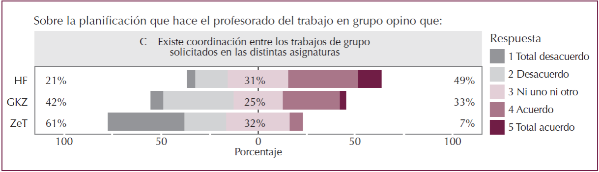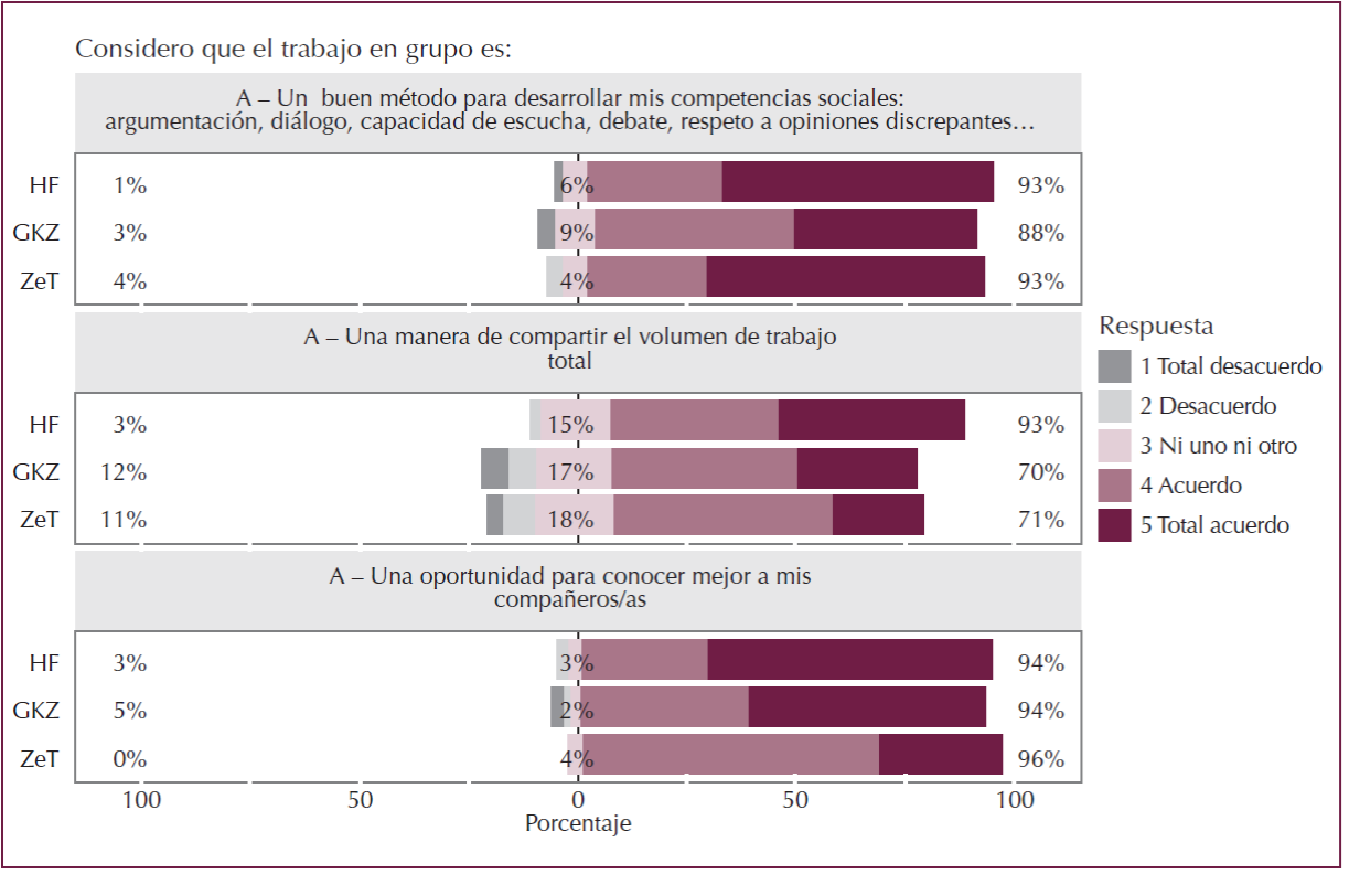 La mayor cantidad de diferencias con el grupo de la Facultad de Educación se encuentran entre las respuestas dadas por el alumnado de la Facultad de Ciencias Sociales y Comunicación. Así, entre los alumnos de la GKZ es relevante que las valoraciones positivas se encuentran en menor medida en las siguientes dimensiones, que abordan las siguientes cuestiones: qué es el trabajo grupal, su utilidad, la explicitación de criterios organizativos y el funcionamiento interno del grupo. Así mismo, sólo en este grupo se valora positivamente la posibilidad de llevar a cabo por parte del docente un control de asistencia a clase. Por último, la valoración de la coordinación del profesorado es levemente más negativa que positiva o neutra, al igual que ocurría en los resultados del estudio de Feria et al. (2017).