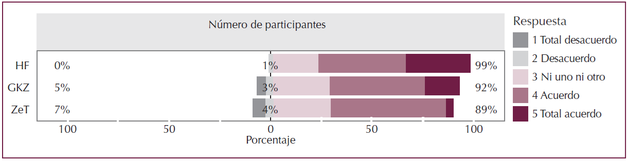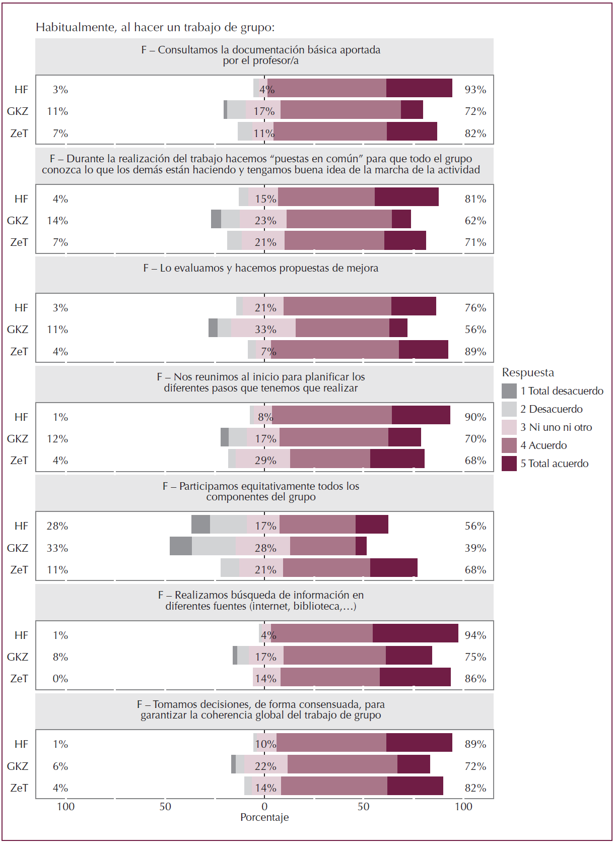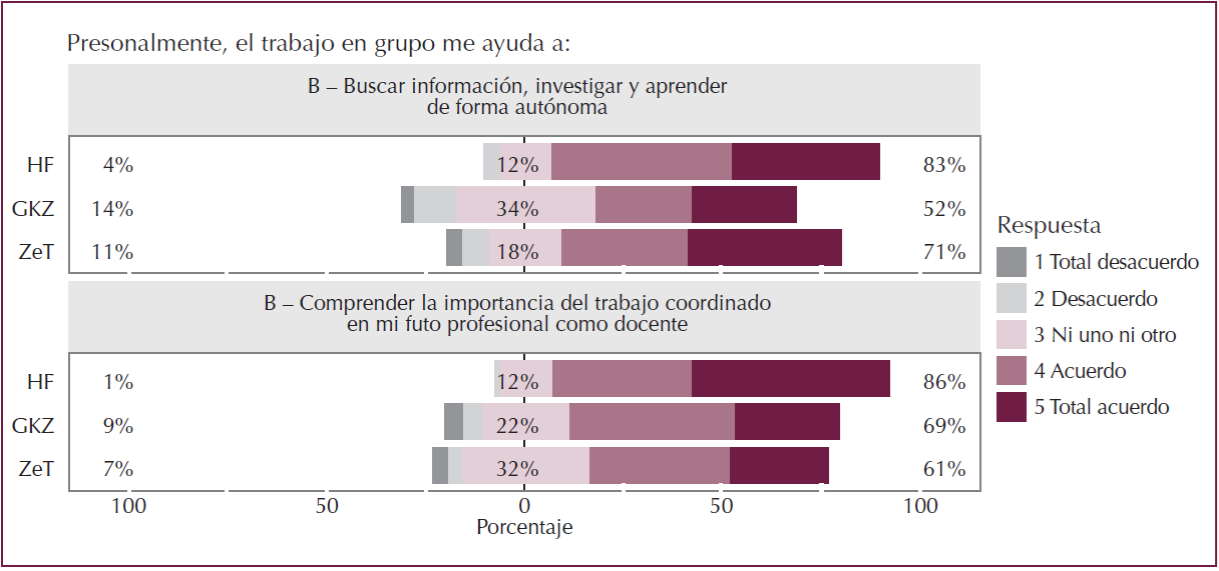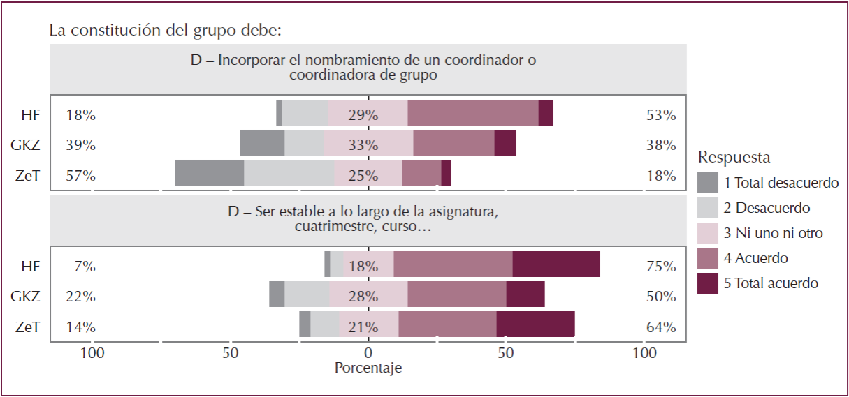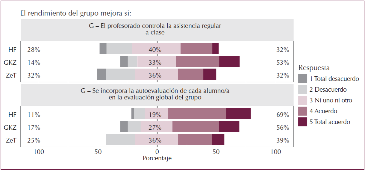 Tanto un ítem como el otro se refieren a algún tipo de control externo, vinculado a la acción del profesorado sobre la actividad del grupo, que genera más rechazo en la ZeT y la HF que en la GKZ, facultad que presenta los mayores niveles de acuerdo en dos aspectos; por un lado, creen que el profesorado debe controlar la asistencia regular a clase, por otro lado, ven necesaria la autoevaluación de cada alumno/a.
