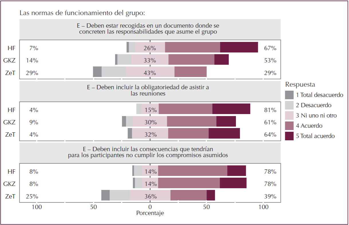 ► Normas de los grupos. Se indica con la letra E y se evalúa con ítems que incluyen la afirmación: Las normas de funcionamiento del grupo