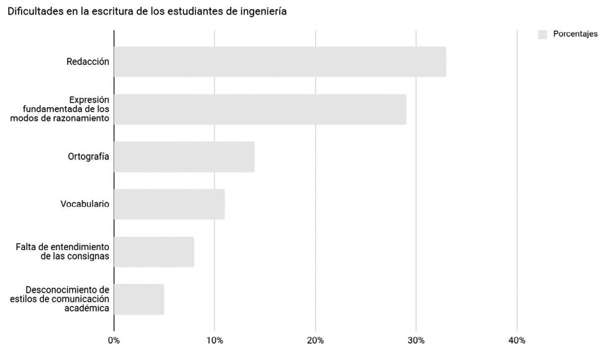 Como aproximación general, el profesorado explicita que, si bien los estudiantes realizan constantemente informes, éstos no requieren de grandes redacciones y muchas veces desconocen cómo estructurarlo. Consiguientemente, plantean que los estudiantes no están acostumbrados a las normas básicas de estándares internacionales ni a estilos típicos de comunicación académica. Según los docentes, estas dificultades los tornan inseguros, por lo que extienden el tiempo que les lleva realizar un trabajo. Aquí es pertinente realizar una analogía con los postulados de Flores (2014), quien asevera que no sólo se trata de enseñar estrategias, sino de identificar a la comunidad discursiva a la que se desea pertenecer e intervenir; promoviendo la reflexión y profundizando el conocimiento. Esto implica, en primer lugar, identificar las inseguridades de los estudiantes de ingeniería, proyectando prácticas de escritura de acuerdo con los géneros discursivos en dicho campo del saber.