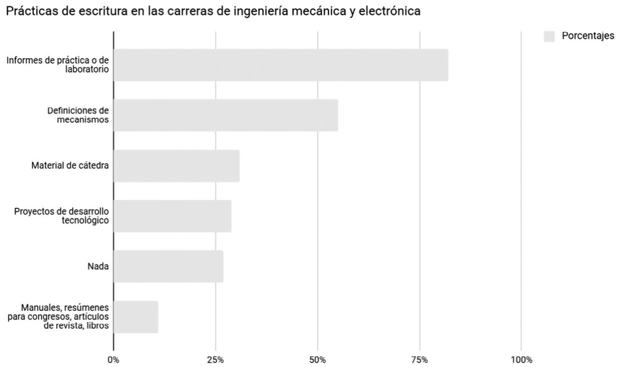 Consultados sobre aquello que escriben, los encuestados eligieron mayoritariamente informes de prácticas o de laboratorio (82 %), definiciones de mecanismos (55 %), material de cátedra (31 %) y proyectos de desarrollo tecnológico (29 %). Es interesante observar que la respuesta "nada" obtuvo un porcentaje significativo (27 %) y que los manuales, resúmenes para congresos, artículos de revista y libros fueron la opción menos elegida (11 %).