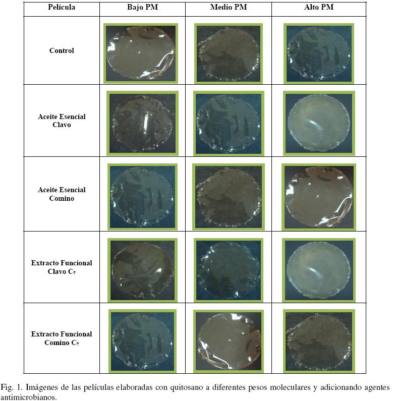 Con base a los resultados obtenidos en la determinación de la CMI y la CMB se seleccionaron los AE y EF que presentaron mayor actividad antimicrobiana contra las bacterias estudiadas. Así mismo, se seleccionaron las CMI dentro de las cuales existió un efecto bacteriostático. Los aceites esenciales y extractos funcionales que mayoractividad biologica presentaron fueron: comino a 750 mg/L, clavo a 500 mg/L, cominoE7 a 750 mg/L, clavoE7 a 500 mg/L. En la Fig. 1 se muestran las diferentes características observadas en las películas elaboradas dependiendo del peso molecular que fue utilizado. Se observó que las películas elaboradas con quitosano de bajo peso molecular eran color amarillo/ambar, faciles de desprender, homogeneas y sin olor característico de los antimicrobianos incorporados. Así mismo, se pudo observar que las películas de medio peso molecular fueron quebradizas, a excepción de las elaboradas adicionando aceite esencial de clavo y comino. Sin embargo fueron las películas de alto peso molecular, las que presentaron mayor resistencia al quiebre. La mayoría de las películas elaboradas con medio peso molecular fueron color amarillo/ámbar excepto las adicionadas con aceite esencial de clavo. En el caso de las elaboradas con alto peso molecular se encontraron tres escalas de color diferente: amarillo/ámbar para AE de comino y EF de comino E7, blanco con AE de clavo y EF clavo E7 y por último, transparente utilizando quitosano control. Las películas que presentaron mayor facilidad de desprendimiento, a alto peso molecular son en las que se adicionó AE de clavo, sin embargo, éstas también conservaron un fuete olor del aceite esencial. Otras que presentaron estas mismas características fueron aquellas que contenían AE de clavo, comino y EF de comino con ester E7. A un alto peso molecular se observo, que todas las películas fueron homogéneas, excepto las elaboradas con quitosano solo sin la incorporación de agentes antimicrobianos, las que presentaron mayor facilidad al desprendimiento fueron las que contenían aceite esencial de clavo y el extracto funcional clavo E7.