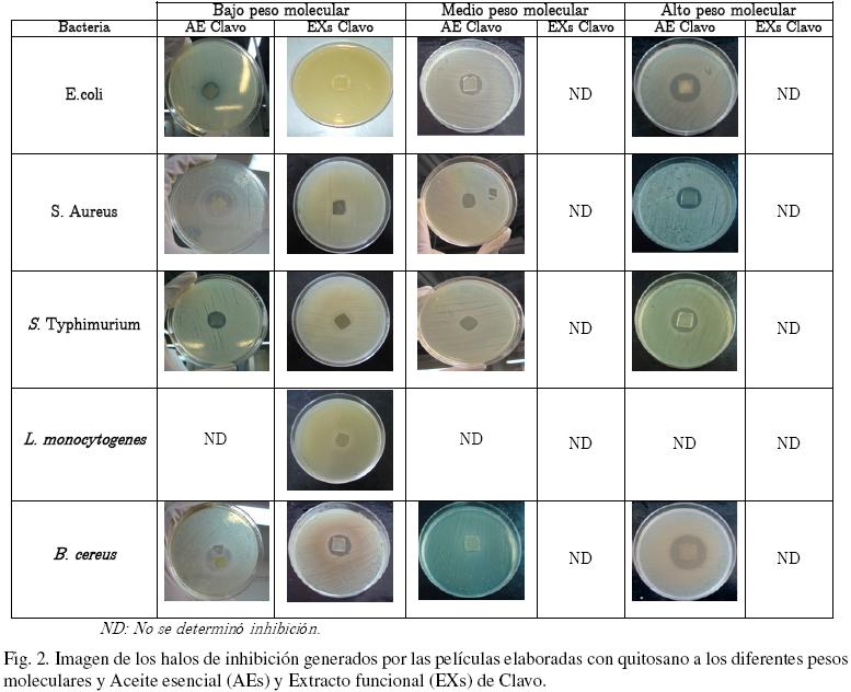 Se evaluaron secciones de las películas elaboradas con quitosano a los diferentes pesos moleculares incorporando los aceites esenciales y extractos funcionales (a las concentraciones establecidas). Se apreció inicialmente que en la parte donde fueron colocadas las películas, no existió crecimiento bacteriano, sin embargo, lo anterior no se consideró como un efecto inhibitorio de las películas, debido a que probablemente lo que ocurrió fue sólo un impedimento físico que no permitió el crecimiento. Una excepción fue el caso de L. monocytogenes, en donde se observó crecimiento sobre algunas de las películas. Los resultados obtenidos de la actividad antimicrobiana de cada una de las películas evaluadas considerando los halos de inhibición generados, mostraron que las películas de quitosano a los tres pesos moleculares estudiados, sin adición de antimicrobianos (control) no exhibieron zonas de inhibición contra las cepas probadas, solo se percibió inhibición en la parte donde fueron colocadas las películas. Hosseini y col. (2008) mencionan que independientemente de la actividad antimicrobiana de este biopolímero debido a sus características naturales, el efecto antimicrobiano del quitosano ocurre sin la migración de agentes activos y que el quitosano no se difunde a través del agar, por lo tanto, sólo inhibe microorganismos en contacto directo con los sitios activos del quitosano. Con respecto a las películas elaboradas con quitosano a los diferentes pesos moleculares estudiados e incorporando los aceites esenciales como agentes antimicrobianos, se observó que en el caso de las películas de quitosano y aceite esencial de comino só lo existió inhibición en las películas elaboradas con quitosano de medio peso molecular contra la cepa de B. cereus (ATCC 11778), determinandose por lo tanto, que las películas elaboradas con este aceite esencial y su extracto funcional no mostraron actividad antimicrobiana. Resultados diferentes se encontraron con las películas elaboradas con el aceite esencial de clavo y su extracto funcional, como se observa en la Fig. 2.