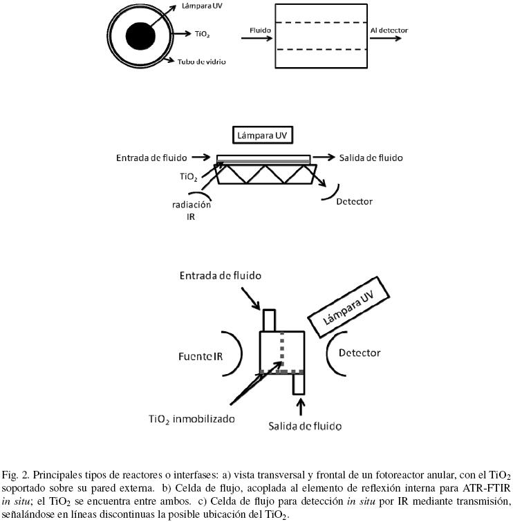 En este caso, el compuesto de interés está expuesto a la radiación IR, cuantificandose la cantidad de radiación transmitida por la muestra, tal como se reportó para la descomposición de acetona (Mattson y col., 2006; Mattson y Osterlund, 2010), la adsorción y reacciones de acido lactico (Chen y col., 2010) o la fotodegradación de 2etanolamina (Tseng y col., 2010), por nombrar algunos ejemplos. Cuando se opta por un seguimiento en línea, el instrumento FTIR se ha colocado en serie con el fotoreactor, tal como lo expusieron en su momento Jacoby y col. (1994) durante la degradación de tricloroetileno. En los casos en que el reactor actúa a su vez de celda del detector (seguimiento dentro de línea o in situ), el TiO2 puede colocarse o no en el paso óptico del reactor (véase Fig. 2c). Por ejemplo, Dombi y col. 2000 situaron el catalizador en la base de la celda para la degradación de tricloroeteno.