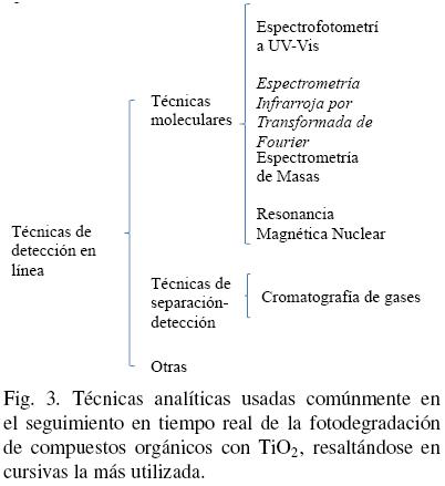 En la Fig. 3 se presenta un esquema con las técnicas en que se basan los analizadores encontrados en el presente trabajo, para el seguimiento en tiempo real de la degradación de compuestos orgánicos. No se hace mención del orden de concentraciones en que se suele trabajar con cada técnica, porque tales magnitudes no sólo dependen de la propia técnica de instrumentación analítica, sino de aspectos estructurales del analito (absortividad molar en algunos casos), instrumentales (tipo de detector en cromatografía de gases, o tipo de fragmentación en espectrometría de masas), aunado a las características del propio fotoreactor y qué tanto favorezca éste efectos de preconcentración o dilución del analito.