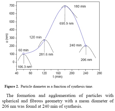 The formation and agglomeration of particles with spherical and fibrous geometry with a mean diameter of 206 nm was found at 240 min of synthesis.