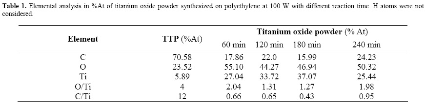 The data show that the C/Ti atomic ratio decreased from 12 in TTP to 0.43 in the powder synthesized at 180 min. In the first 120 min of reaction, C/Ti is very similar, 0.65 to 0.66, and in all cases is less than 1. This ratio indicates that the chemical reactions in the plasma separated a great part of TTP organic fraction which leaves the system, probably as small oxidized hydrocarbon molecules. The inorganic fraction containing titanium oxides remained on the substrates with some hydrocarbon residues.