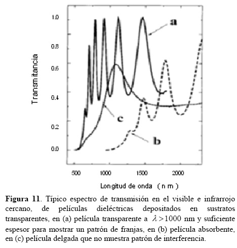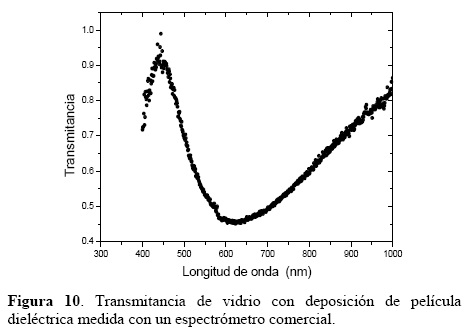 En la figura 10, se muestra la transmitancia de vidrio en función de la longitud de onda, con deposición de película dieléctrica medida con un espectrofotómetro marca Ocean Optics USB4000, 5.1. Se utilizó un software Spectra Suit para Windows XP versión 5.1. La medición experimental se realizó en un barrido de 400 nm a 1100 nm de longitud de onda.
