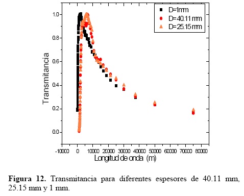 En la figura 11, se muestra un grafico de tres típicos espectros de transmisión de películas delgadas isotrópicas y homogéneas en superficies plano paralelas y depositadas en sustratos transparentes. Nuestros experimentos corresponden a la curva (a), para películas delgadas que no producen un patrón de interferencia [7]. Para graficar la transmitancia del vidrio de diferentes espesores, se midió la transmitancia para diferentes espesores de 40.11 mm, 25.15 mm y 1 mm, con la técnica propuesta, figura 12.
