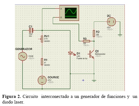 El circuito empleado se muestra en la figura 2, consiste en un circuito emisor y un receptor. En el circuito emisor se interconecta un diodo laser (D1) a un generador de funciones marca BK PRECISION 4040A, con un rango 200 Hz a 20 MHz [1]. Para monitorear las señales de entrada y salida ambas se iterconectan a un osciloscopio marca Agilent Technologies DSO1022 A, 200 MHz 2GS/a. Mediante el generador de funciones, introducimos señales variantes en el rango de radiofrecuencia. El circuito emisor en conjunto con el diodo láser convierte la señal eléctrica de entrada en una señal óptica, por lo que se tiene un circuito electroóptico. En la literatura se puede encontrar que A. Chebbour et al. [3] reportó el empleo de un diodo laser para aplicarlo al control lineal de un motor para un interferómetro heterodino usando una frecuencia de modulación triangular. G. Beheim and K. Fritsch, reportan el empleo de un diodo laser para medir desplazamientos usando frecuencias de modulación [4]. T. Gharbi et al. [5], reportan el empleo de diodo laser modulado en frecuencia para medición de vibración a baja frecuencia. Yanong Ning et al. caracterizan dos diodos laser comerciales para usos interferométricos [8]. Anna Kozlowska et al. emplean diodos laser para arreglos en interferómetros de rejilla modulándolo a través de la variación de corriente [9]. P.Hariharan, describe el efecto de desplazamiento de fase de la longitud de onda del diodo laser al introducir variaciones de corriente [10].