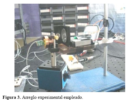 El diagrama del circuito emisor se presenta en la figura 2. Este circuito integra un capacitor de 10 uF a 16 V, una resistencia variable de 2 KΩ. Variando la resistencia en este rango se obtienen diferentes valores de corriente obteniendo diferentes intensidades de luz en un diodo laser marca Sharp Modelo LTMO80MD, λ=632.8 nm, 3 mW. También se emplea una resistencia de 47 Ω que funciona como la resistencia mínima del circuito. Se utiliza una fuente de voltaje marca Agilent E3631A, con el cual se suministra el voltaje requerido para el diodo láser. El circuito emisor se interconecta a las terminales de salida de un generador de funciones. Con el generador de funciones introducimos señales de radio frecuencia, en el rango de 400 a 400,000 Hz, con amplitud de 100 mV. La señal de radiofrecuencia es transportada por medio del haz laser del diodo. De esta manera la señal de radiofrecuencia es la señal moduladora y la del diodo laser es la señal portadora. El circuito receptor consiste en un fototransistor comercial común, el cual responde en el rango visible (400 nm a 700 nm), dos resistencias limitadoras de 220 Ω (R2 y R3), una fuente de voltaje de 4.5 V. Cuando el fototransistor recibe la señal luminosa emitida por el diodo, activa la base del fototransistor cerrando el lazo del circuito, circulando una corriente variable en función de la intensidad de la luz. A través de R3 obtenemos la señal de salida para medir la variación de corriente en el lazo, visualizada en el osciloscopio para grabar datos. La muestra transparente la colocamos entre el diodo laser y el fototransistor. Obtenemos datos al medir mediante el osciloscopio, el voltaje de salida a una frecuencia específica. Cuando el haz de luz atraviesa la muestra parte de la luz es absorbida y parte es transmitida. La luz transmitida es recibida por el fototransistor y medimos el voltaje de salida en el osciloscopio. De esta manera colectamos un conjunto de datos, que nos permite graficar frecuencia contra voltaje de salida o entrada. Es importante señalar que a diferencia del sistema tradicional para medir transmitancia, que mide intensidad de luz, nosotros medimos voltajes. Otro aspecto a remarcar, es que nuestro sistema es independiente del ángulo de incidencia, a diferencia del sistema tradicional cuya incidencia angular influye en los datos. El circuito se muestra en la figura 2 y el arreglo experimental en la figura 3.
