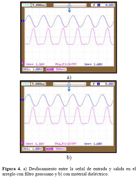 Empleando el osciloscopio, se muestra el desfasamiento entre la señal de voltaje de entrada (línea amarilla) en el circuito emisor y la señal de voltaje de salida en el fototransistor del circuito receptor (línea verde) después de que el haz de luz láser ha pasado por la muestra de vidrio con dieléctrico, Figura 4. Se registra como voltaje de entrada, al voltaje que se proporciona de la fuente al circuito emisor, y el voltaje de salida es el voltaje medido en el circuito receptor.