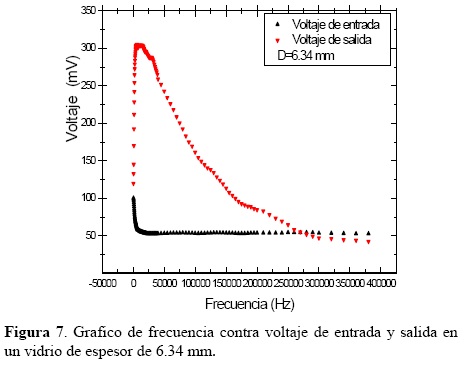 Se puede observar en la figura 6 que el valor máximo de voltaje de salida es de 305.6 mV para una frecuencia de 6200 Hz en un vidrio de 25.15 mm de espesor, comparando con un vidrio de espesor 1 mm que tiene un valor de voltaje de salida máximo en 328 mV para una frecuencia de 11000 Hz.