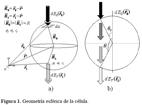 Supóngase que se tiene un sistema de n células, cada una con el mismo coeficiente de absorción αs , suspendidas en un medio ópticamente no absorbente con coeficiente de absorción α f , ( α f << α s ). Tanto las células como el medio se suponen homogéneos, isotrópicos y lineales. Dado que las dimensiones espaciales de las células son del orden de 20 μm , se puede suponer que tienen forma esférica de radio R centrada en el punto rk ' , y suponiendo que la luz incide sobre ellas en la dirección z .