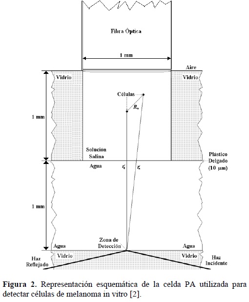 En la Figura 2 se muestra una representación esquemática de la celda PA previamente utilizada para detectar células de melanoma in vitro, [2]; las condiciones experimentales están descritas en el mismo artículo, y son satisfechas por el modelo aquí propuesto.