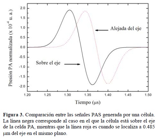 En la Figura 3, se muestra la señal PA en función del tiempo para el caso de una célula en dos posiciones diferentes. La primera posición fue en el eje de la celda PA, mientras que la segunda estuvo a 485 µm del eje, ambas en el mismo plano z = 2 mm. La señal PA de la célula más alejada se desplazó con respecto a la de la otra, debido a que la distancia entre la fuente PA y el sensor se incremento, y por ello su amplitud decreció. Como se puede observar en ambas posiciones, el comportamiento de las señales PA corresponden al de una muestra esférica [17, 18], aun cuando se supuso una densidad de energía efectiva localizada en un punto.