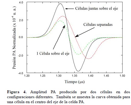 En la Figura 4, las amplitudes PA en función del tiempo, producidas por dos células en dos configuraciones diferentes, son mostradas. La línea continua negra representa la amplitud PA de las dos células juntas en una posición en la que sus centros estaban a 7.5 µm del eje de la celda PA, en z = 2 mm. La línea discontinua verde corresponde a la señal PA producida por una célula colocada sobre el eje en el mismo plano que las dos células anteriores. Como se puede observar la amplitud PA de una sola célula es la mitad de la obtenida para dos células juntas. Lo anterior se debe a la interferencia constructiva de las señales independientes de las dos células. La línea discontinua roja es la señal PA producida por dos células, una de ellas colocada con su centro sobre el eje de la celda PA y la otra alejada 485