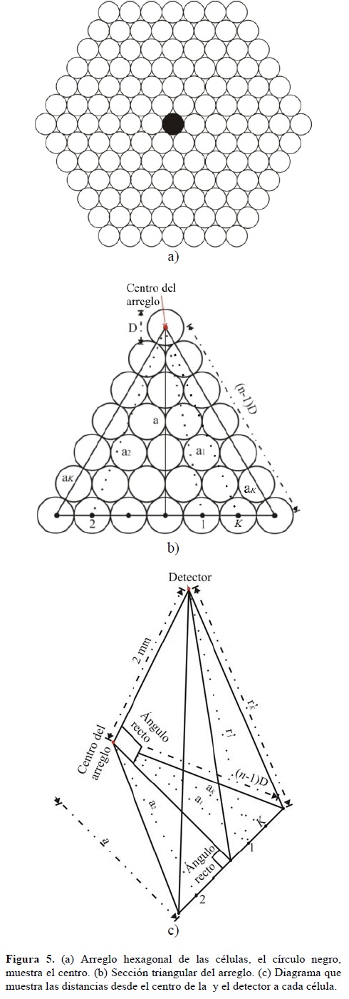 En la Figuras 5.b y 5.c, se muestra la geometría utilizada para calcular la distancia que hay entre cada una de las células y el sensor. El arreglo se puede dividir en 6 triángulos equiláteros de lados igual a (N-1) D y altura dada por