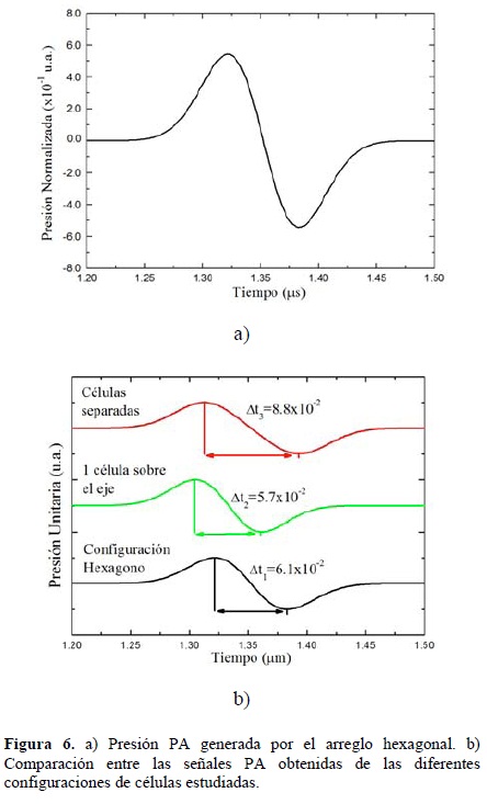 En la Figura 6.a, se muestra la presión PA generada por un arreglo hexagonal de 3367 células. Comparando ésta presión con la producida por una célula, Figura 3, se puede observar que, debido a la interferencia que ocurre al sumar las presiones PA de cada una de las células, la amplitud PA solo se incrementó del orden de 300 veces, y no 3367. En la Figura 6.b, se graficaron las presiones PA divididas por su valor máximo para: una célula sobre el eje (línea verde), dos células separadas (línea roja) y el arreglo hexagonal (línea negra). Como se puede observar, el intervalo temporal entre el máximo y mínimo de la presión vario debido a la interferencia, sin embargo se observa que hay más interferencia destructiva para las dos células que para el arreglo, esto se debe a la distancia de separación que hay entre ellas. En el arreglo hexagonal las células se simularon una junto a la otra, mientras que las otras dos estuvieron 485 micrómetros.