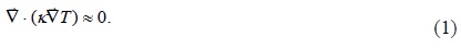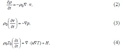 Donde κ es la conductividad térmica del fluido y ∇ es el operador nabla. También se supone que las variaciones de presión y densidad son pequeñas respecto a los valores ambientales, y que la velocidad de las partículas perturbadas en el tejido son mucho menores que la velocidad del sonido. Esta suposición lleva a que tanto el momento y masa sean lineales, por lo que las ecuaciones de conservación de masa, momento y energía pueden ser utilizadas como punto de partida, las cuales están dadas por [7, 8];