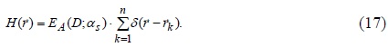 es la función delta de Dirac espacial. Al multiplicar la Ec. (16) por la función, f (t), que describe la razón temporal de deposición de energía, se obtiene la densidad de energía puntual por unidad de tiempo. Si hay n células localizadas en