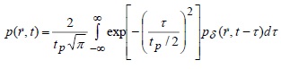 Para un haz pulsado de perfil temporal Gaussiano de ancho en 1/e igual a t p , la presión está dada por [16]