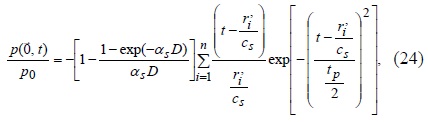 En este trabajo, desde el punto de vista óptico, se supuso que las células conformaban un sistema de objetos absorbentes inmersos en un medio no absorbente, simulando a la densidad de energía por unidad de tiempo, absorbida por las células, mediante un modelo efectivo tipo Lambert-Beer, para objetos simétricamente esféricos. Los pulsos cortos se modelaron suponiendo que la perturbación tiene una duración infinitesimal dada por una función delta de Dirac en el tiempo. Desde el punto de vista mecánico, se supuso que el efecto PA generado en las células era a través del mecanismo de expansión termoelástica, por lo que la presión PA generada se gobierna por la Ec. (8). La solución para esta ecuación se obtuvo utilizando el principio de Duhammel [7, 9, 12- 14] en la Ec. (10), el cual consiste en pasar la ecuación de onda inhomogénea a una ecuación de onda homogénea con valores iniciales dados por el término de inhomogeneidad espacial. La solución se representó en términos de la integral de Kirchhoff la cual, con las aproximaciones propuestas y la Ec. (9), permitió obtener una expresión analítica de la presión PA. Finalmente, se realizó una comparación cualitativa de los resultados obtenidos teóricamente con los resultados experimentales reportados para la detección de células de melanoma in vitro [2].