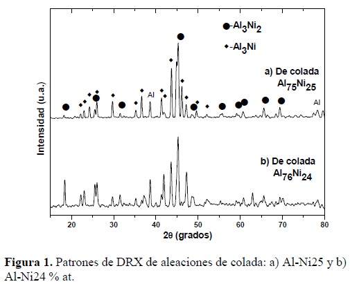 Los difractogramas de las aleaciones fabricadas por colada convencional correspondientes a las composiciones Al-Ni25 y Al-Ni24 % at son mostrados en las figuras 1a-b. Fueron indexadas las siguientes fases: una solución sólida base aluminio (fcc) con parámetro de red = 4.08 Å, la fase intermetálica NiAl3 cuya estructura es ortorrómbica y con parámetros de red; a = 6.6114 Å, b = 7.3662 Å y c = 4.8112 Å, y la fase intermetálica Ni2Al3 de estructura hexagonal y parámetros de red; a = 4.0363 Å y b = 4.9004 Å. La presencia de tres fases coexistiendo expone la dificultad que tienen los intermetálicos para fabricarse como fases únicas, ya que originalmente se deseaba trabajar con el compuesto NiAl3. Esta dificultad radica en que estos compuestos, guardan una relación estequiométrica bien definida, lo que conlleva a regiones estrechas de campos de fase en los diagramas de equilibrio.