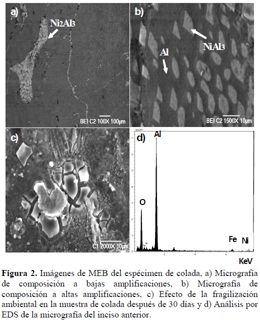 La figura 2a-b corresponde a imágenes de MEB por composición, las cuales confirman la presencia de las tres fases predeterminadas mediante DRX, dos intermetálicas en medio de una matriz de aluminio. Como puede observarse de la figura 2a, una gran segregación química de fases se presenta, grandes granos de la matriz de aluminio contienen a la fase NiAl3 (figura 2b), la fase intermetálica Ni2Al3 se encuentra segregada a lo largo de las fronteras de grano, lo que coincide con el diagrama de fase de estas aleaciones, ya que en equilibrio a esta temperatura, esta última no debería existir, lo que habla de la segregación química del proceso. Se puede considerar que realmente la microestructura presente en estas aleaciones, puede ayudar al proceso de fragilización ambiental, justificando este estudio a pesar de la presencia de tres fases, ya que presumiblemente se podría deducir que el ataque de humedad comenzará preferencialmente a lo largo de las fronteras de grano, dada la irregularidad de las mismas y porosidad excesiva, ahora, en esta región se determina que existe una mayor proporción de la fase intermetálica Ni2Al3, con menores proporciones de la fase NiAl3, sin embargo, los resultados por DRX, en seguida mostrados, darán un mejor entendimiento del fenómeno. La micrografía topográfica obtenida por MEB ilustrada en la figura 2c, confirma la severidad del ataque de humedad ambiental a través del proceso de fragilización en estas aleaciones. Puede notarse que a un mes de su preparación, se encuentra recubierta por una capa fracturada y porosa cuya composición química es mostrada en la figura 2d, en donde se observan, básicamente, los elementos aluminio y oxígeno, lo que sugiere una gran oxidación superficial de la muestra y la aguda susceptibilidad ambiental por hidrógeno en estas aleaciones.