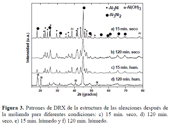 No obstante que las muestras fueron realizadas con un barrido lento de rayos X, para colectar la mayor cantidad de señal de las fases, se observa en la muestra correspondiente a 120 min, un ensanchamiento y disminución en la intensidad de los picos derivados del proceso, dificultando su caracterización y detalles como cuál de las fases presentes contribuye en mayor proporción de aluminio a la reacción. Esa disminución en intensidad y ensanchamiento de picos es mayor en comparación a las muestras molidas en seco lo que supone la influencia en el tamaño de cristal por la fragilización de hidrógeno inducida. Sin embargo, el pico que prevalece claramente de las fases metálicas, es el correspondiente al intermetálico Ni2Al3, siendo razonable su identificación, dado que corresponde al pico de mayor intensidad en toda la mezcla de fases, aunque esto sugiere mayor investigación al respecto.