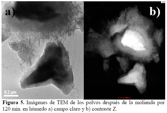La figura 5a y b muestra imágenes de campo claro y contraste Z obtenidas por microscopía de trasmisión de la muestra molida en húmedo por 120 min. En ambas se confirma que las partículas metálicas reaccionan con el agua y forman una capa superficial del compuesto hidratado, este último siendo poco cristalino, ya que no se lograron obtener tanto patrones de difracción como imágenes en el modo de alta resolución, además, al encontrarse recubriendo a las partículas metálicas, impide conocer la estructura de las mismas, situación que quedará pendiente para una investigación en el futuro.