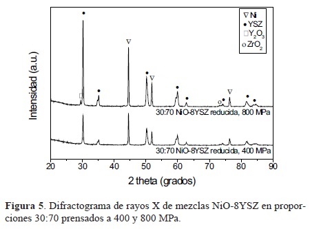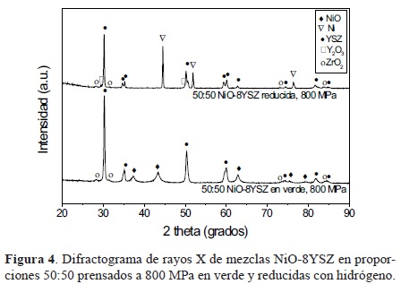 La Figura 4 muestra una comparación de los difractogramas obtenidos para compactos 50:50 en verde (parte inferior) y los reducidos (parte superior), los cuales confirman que el oxido de níquel se reduce sin afectar la fase cristalina de la zirconia estabilizada (8YSZ). Para esta composición la reducción del NiO es total, dado que no se aprecian los picos correspondientes a esta fase en el compacto reducido. En la Figura 5 se presentan el efecto de la presión de compactación sobre la reducción de los óxidos, a través de los difractogramas de compactos en verde compactados a presiones de 400 y 800 MPa, posteriormente sinterizados (reducidos) a una temperatura de 1100 °C, durante un tiempo de 2 h y en atmósfera de H2. Los difractogramas permiten establecer que, en las condiciones de presión de compactación analizadas, no se produce un efecto negativo sobre la capacidad de reducción del H2 sobre el NiO a consecuencia de un mayor nivel de densificación. Por lo tanto, al incrementar la presión (densidad de los compactos) no se hace más difícil el paso del gas reductor entre la pieza compactada, por lo tanto no disminuye la cantidad de NiO reducido. Lo anterior se evidencia al observar similares reflexiones en los difractogramas, independientemente de la presión de compactación seleccionada.