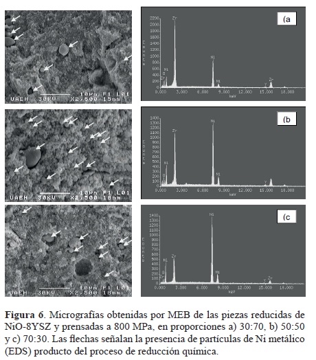 El aspecto superficial de los compactos se presenta en la Figura 6, donde se muestran micrografías de compactos de mezclas de NiO:8YSZ en proporciones 30:70, 50:50 y 70:30 prensados a 800 MPa y posteriormente reducidos, donde se comprobó mediante EDS la composición a base de Zr, Ni y O, que si se analiza conjuntamente con los resultados de difracción de RX mostrados anteriormente, permite confirmar la presencia de partículas reducidas de níquel metálico, mediante el análisis puntual con EDS sobre dichas partículas. Adicionalmente, las micrografías muestran una distribución homogénea de partículas de níquel por toda la matriz cerámica de 8YSZ.